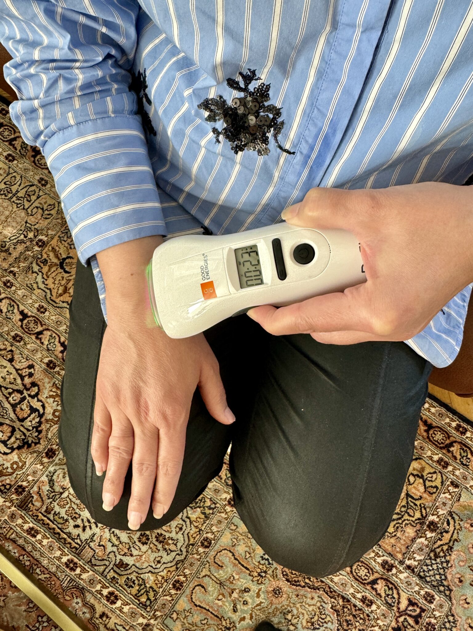 ”Muistan hyvin ensimmäiset hoitokerrat. Laserin osuessa iholle tuntui paikallista, miedosti kuumottavaa tunnetta. Se ei ollut missään nimessä epämiellyttävää, enemmänkin merkki siitä, että jotain tapahtui hoidettavalla alueella. Noudatin Terveystekniikka Oy:n ohjeita tunnollisesti ja pyrin hoitamaan kipeitä alueita päivittäin. Välilevyn pullistuman oireisiin pyysin apuria kohdistamaan laseria alaselkään ja itse hoidin pohkeita ja polvea. Olkapään ja niskan särkyjen yllättäessä hoidin myös niitä. ”