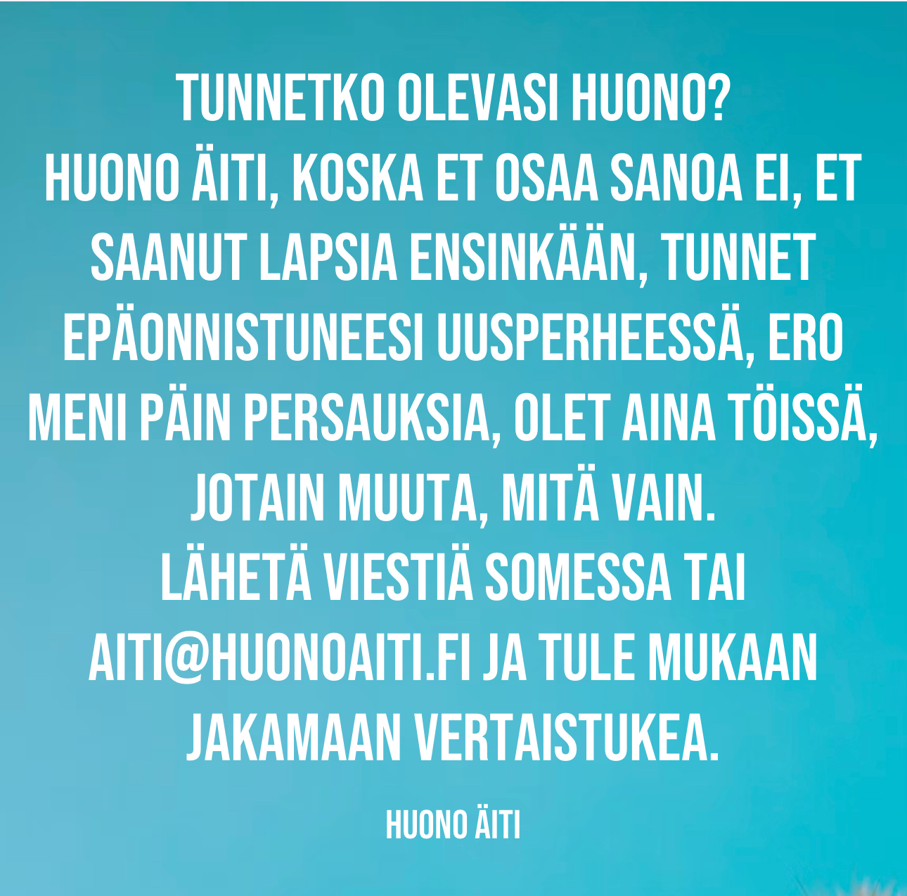 Kirjoittaja kuuluu Huono Äiti -yhteisöön. Enää Huono Äiti ei ole vain yksi nainen, joka kirjoittaa hassuja juttuja blogiinsa (yleensä yöpuvussa epätyypillisiin aikoihin) vaan meitä on monta. Kiitos, kun luet Huonoa Äitiä, tervetuloa myös kirjoittamaan!