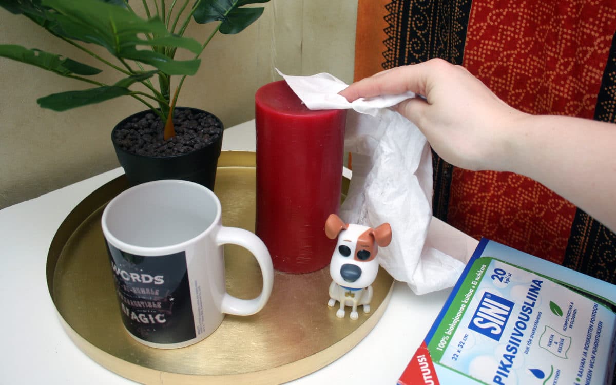 Seuraavaksi nappaa paketista Sini Pikasiivousliina, ja pyyhi kaikki välittömästi näkyvät pinnat ja tasot. Keittiön pöytä, tiskipöytä, hella jne. Huuhtele tarvittaessa ja pyyhi kunnes koko keittiö kiiltää (ei mene edes kauaa). Kertakäyttöiset pikasiivousliinat ovat hygieenisiä, hajusteettomia, Allergia-, iho ja astmaliiton hyväksymiä, ja 100% kompostoituvina myös ekologisia. Älä kuitenkaan vielä heitä pois, sillä liina on sen verran kestävä että käytetään sitä vielä myöhemmin WC:n pesussa.