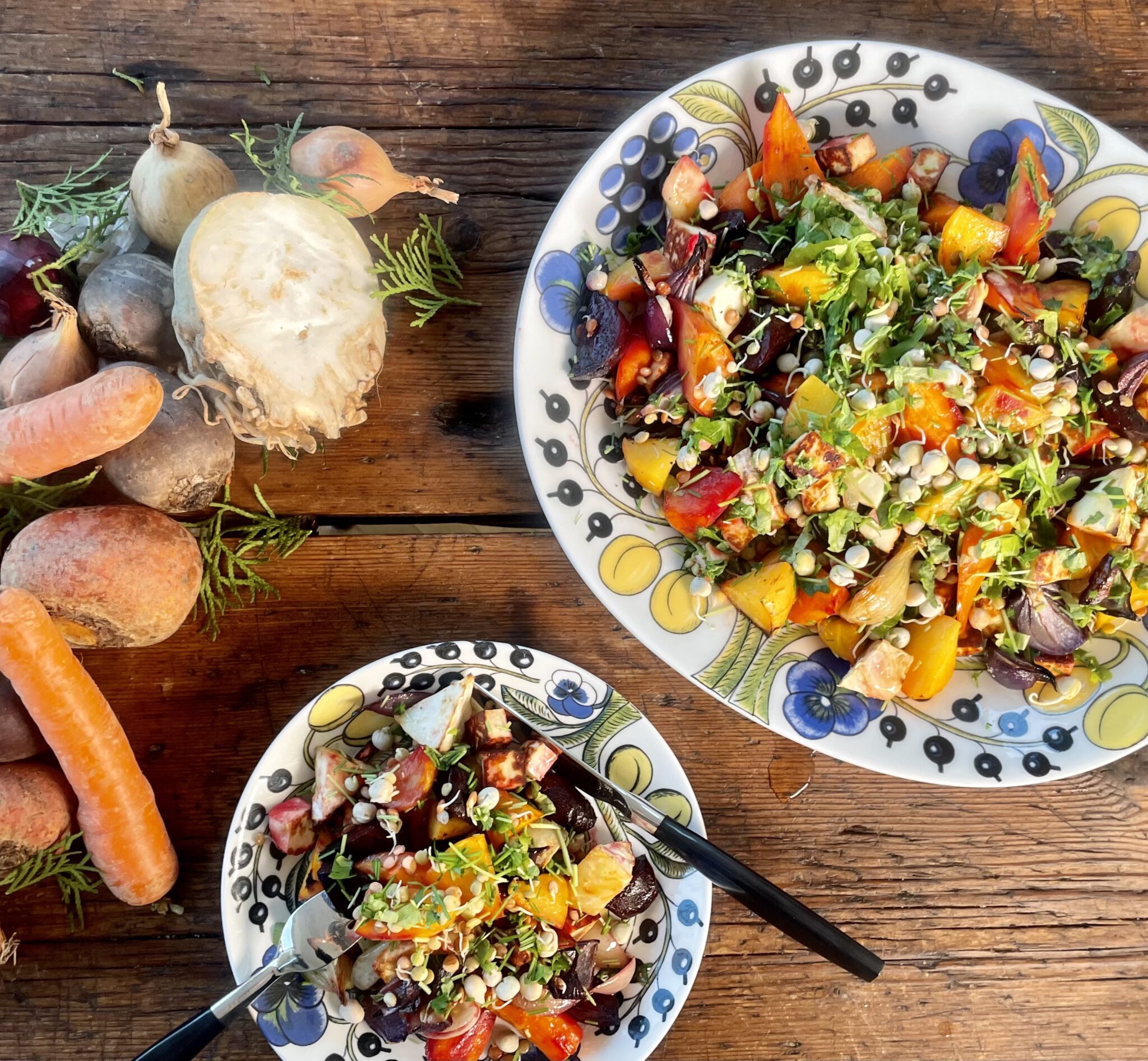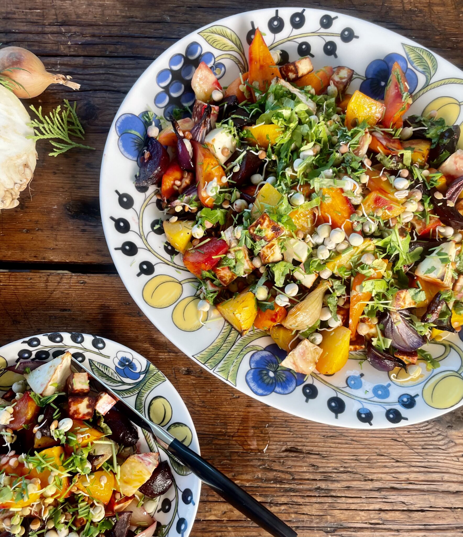 Yksi halvimmista kotimaisista raaka-aineista kaupassa ovat juurekset. Tässä kasvisreseptissä proteiinina toimii kotimainen grillijuusto. Voit myös hyvin käyttää salaattijuustoa, kotijuustoa tai leipäjuustoa. Tällöin voi myös juuston paistamisen jättää välistä. Myös juureksia voi vaihdella oman maun mukaan.