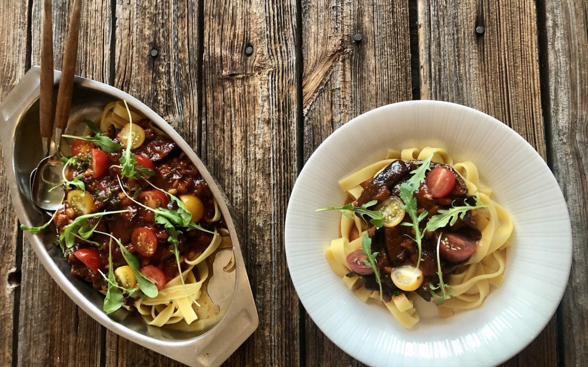 Kaada joukkoon kasvisliemi ja keitä miedolla lämmöllä, kunnes munakoisot ovat täysin pehmenneitä. Lisää pinjansiemenet sekä hienonnetut timjami ja oregano, ja mausta suolalla. Keitä tuorepasta runsaassa kiehuvassa suolalla maustetussa vedessä ohjeen mukaan (yleensä 2–4 minuuttia). Halkaise kirsikkatomaatit puoliksi ja viimeistele kastike niillä sekä rucolalla. Rouhi lopuksi pippuria päälle.