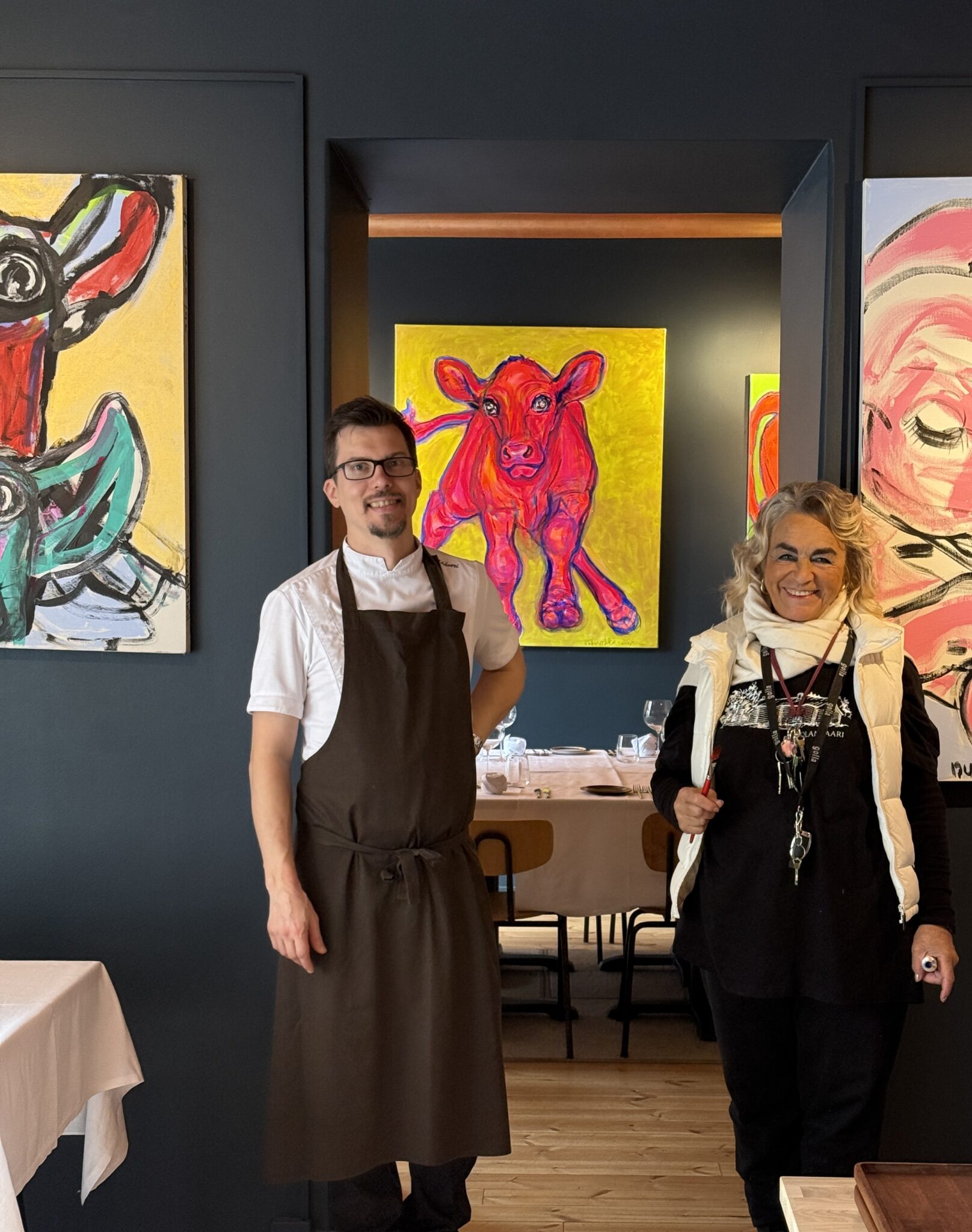 Le Ankan kabinetissa on vaihtuva taidenäyttely. Tällä hetkellä tila on täynnä Miina Äkkijyrkän upeaa taidetta.