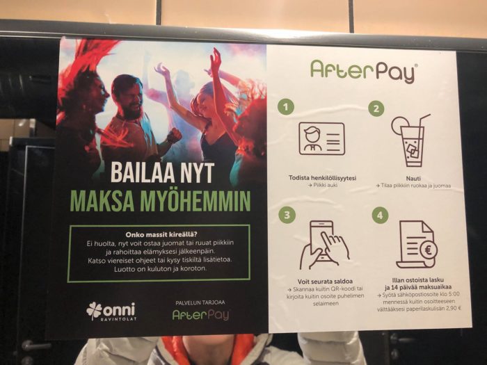 Mainoksessa annetaan ymmärtää, että kivan illan rahoittaminen on näin helppoa! On toki mahdollista, että asiakas maksaa ”piikkinsä” heti pois, mutta kuinkakohan usein niin käy? Maksuaikaa on kuitenkin 14 päivää. Siinä ajassa voi ehtiä useamman kerran uudelleen viettämään ravintolailtaa ja taas tilata juomia ”piikkiin”. Entä jos juominen on jo ongelma?