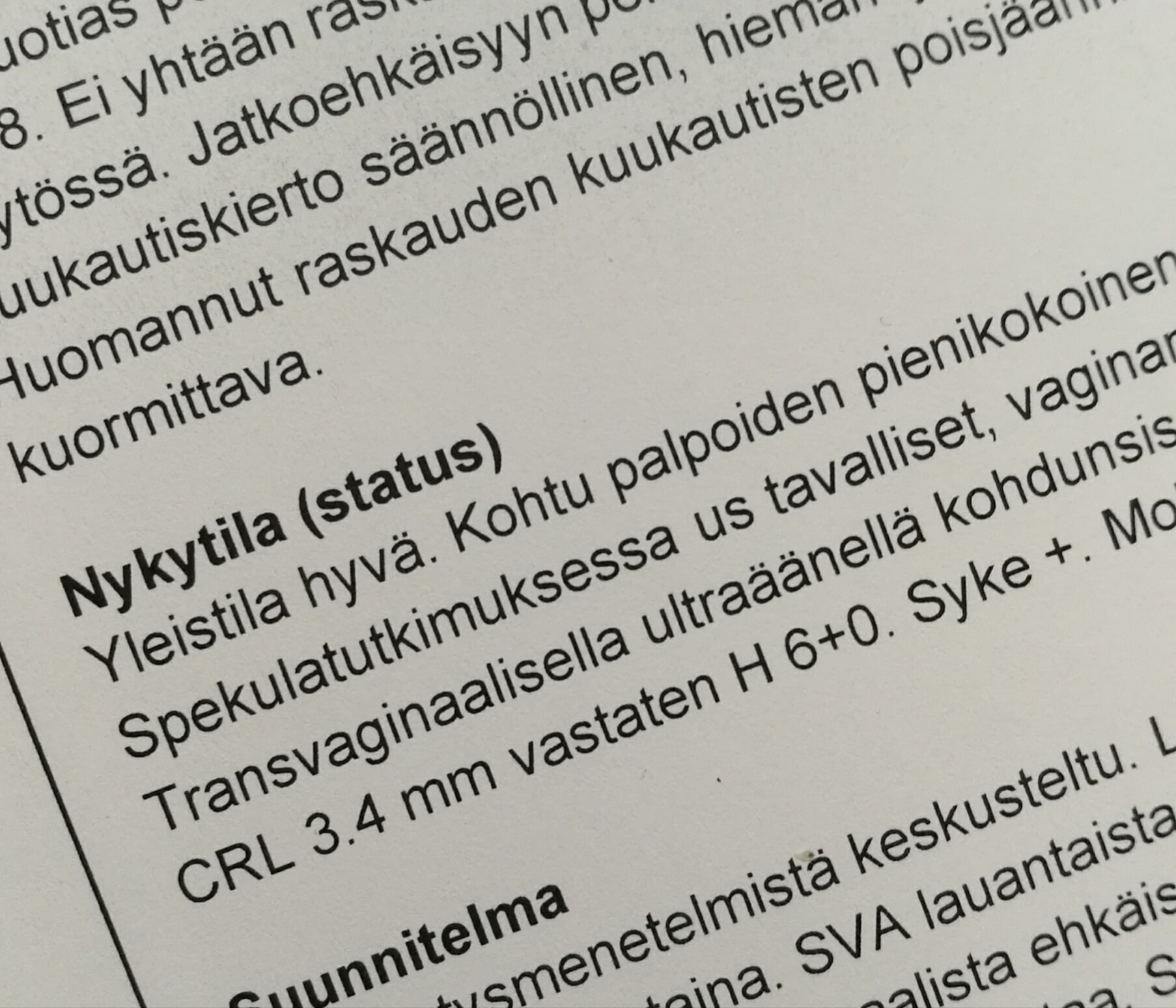 Raskaus oli yllätys, sikäli kun se koskaan on. Olimme varomattomia, mutta meillä oli jo ikää, ja miehen hedelmällisyyden kanssa oli aiemmin ollut niin ja näin. En uskonut raskauden mahdollisuuteen, ja olin päättänyt, että lapseni on jo tehty. Harkitsin silti pitkään ja hartaasti lapsen pitämistä. Pidin raskaaksi tulemistani onnellisena sattumana, elämäntilanne oli vain niin kovin vaikea.